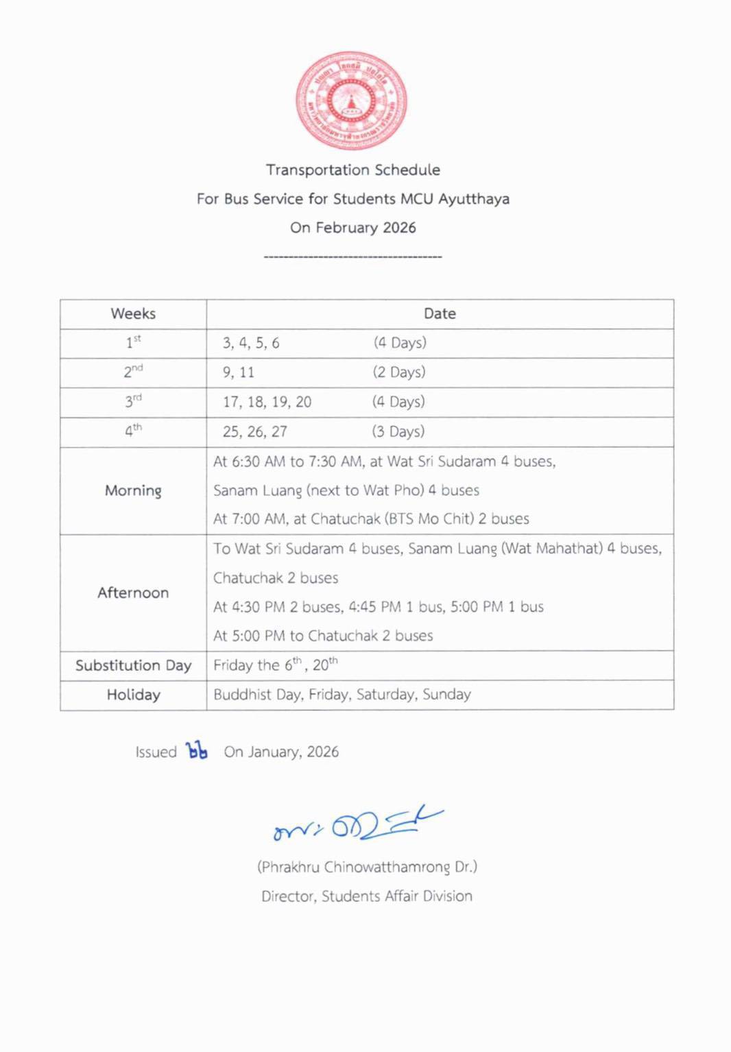 ตารางบริการรถเมล์ ขสมก. รับ-ส่ง เดือน กุมภาพันธ์ 2569