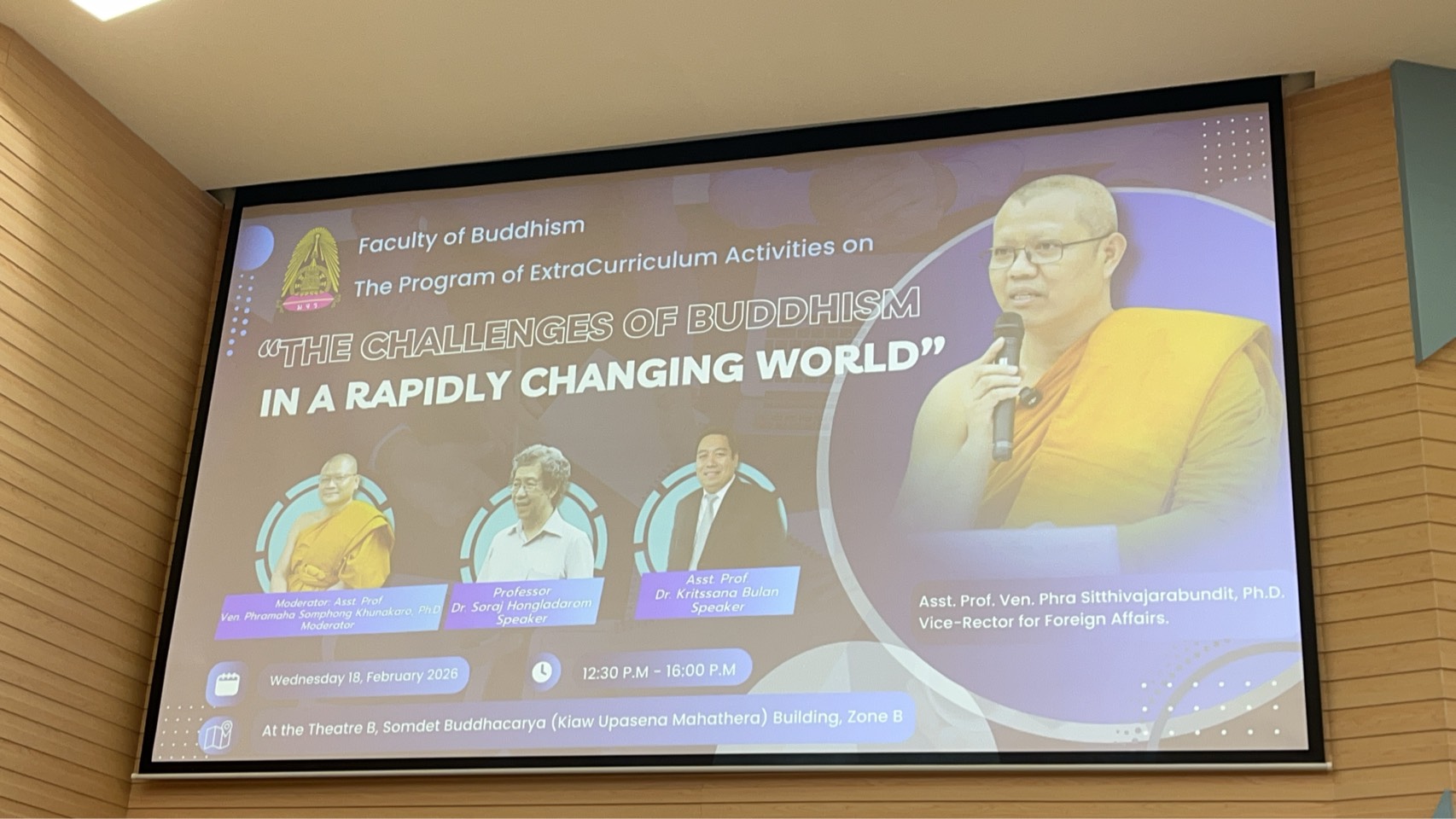 เมื่อวันที่ 18 กุมภาพันธ์ พ.ศ. 2569 คณะพุทธศาสตร์ จัดโครงการปิจฉิมนิเทศนิสิตพุทธศาสตรบัณฑิต รุ่น 72 ในภาคเช้าและภาคบ่าย The Program of ExtraCurriculum Activities on ‘THE CHALLENGES OF BUDDHISM IN A RAPIDLY CHANGING WORLD’ ณ อาคารสมเด็จพระพุฒาจารย์ (เกี่ยว อุปเสณมหาเถระ) โซน บี มหาวิทยาลัยมหาจุฬษลงกรณราชวิทยาลัย