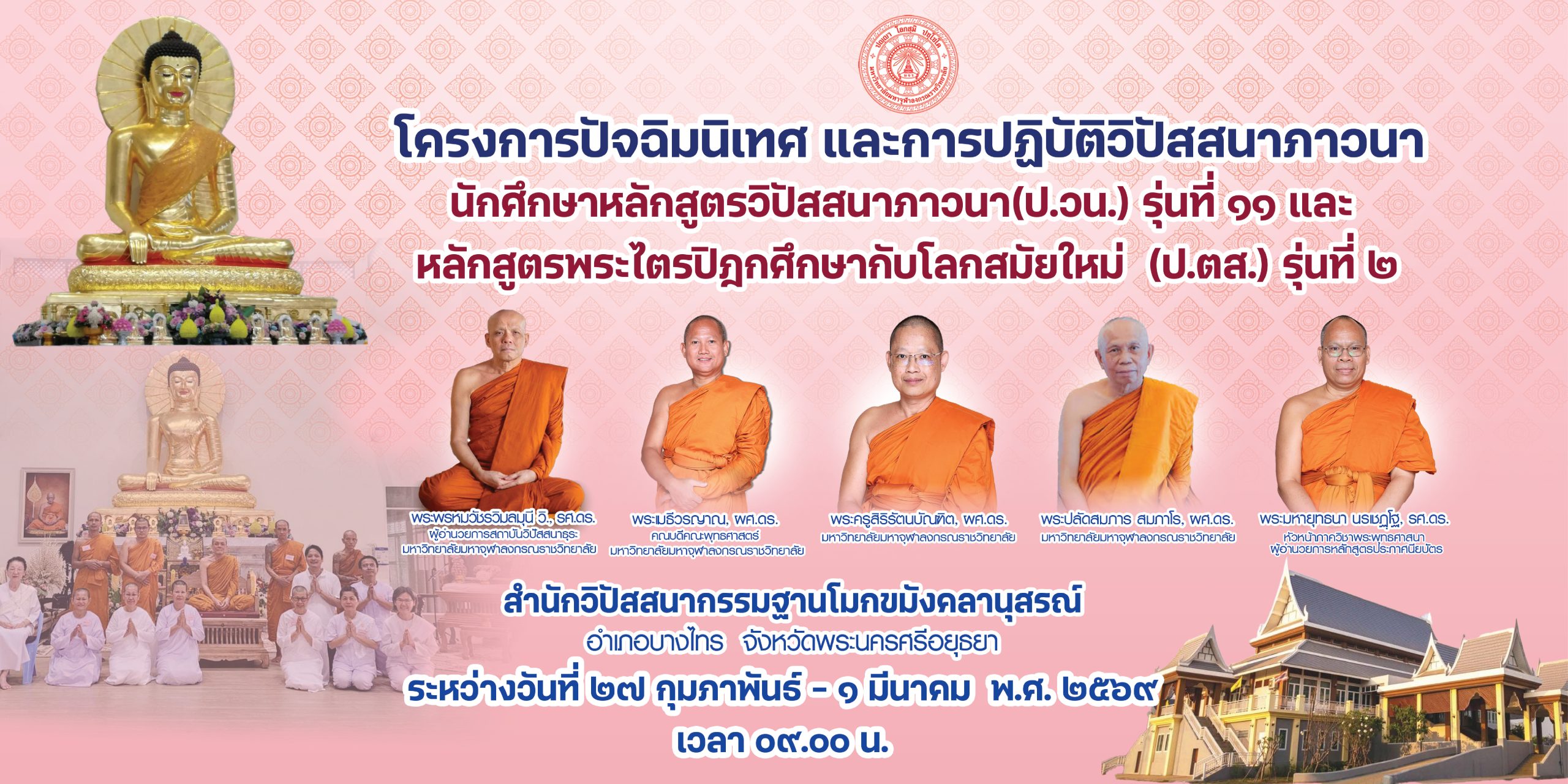 หลักสูตรใบประกาศนียบัตร ภาควิชาพระพุทธศาสนา จัดโครงการปัจฉิมนิเทศและปฏิบัติวิปัสสนาภาวนา ของนักศึกษา ป.วน. รุ่น 11และป.ตส. รุ่น 2 ระหว่าง 27 กุมภาพันธ์ – 1 มีนาคม พ.ศ. 2569 ณ สำนักวิปัสสนาภาวนาโมกขมังคลานุสรณ์