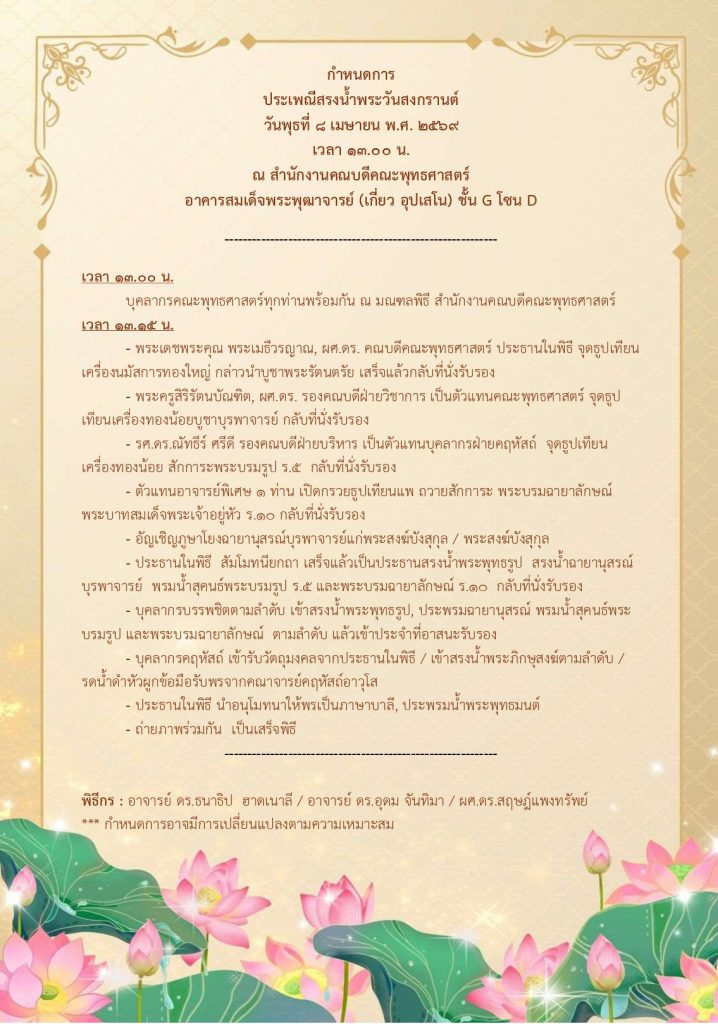 ขอเชิญบุคลากรคณะพุทธศาสตร์ เข้าร่วมเนื่องจากกิจกรรมประเพณีสงกรานต์ ประจำปี 2569