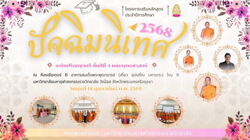 คณะพุทธศาสตร์ จัดโครงการปัจฉิมนิเทศนิสิตพุทธศาสตรบัณฑิต รุ่น 72 ภาคภาษาไทยและภาษาอังกฤษ เมื่อวันที่ 18 กุมภาพันธ์ พ.ศ. 2569 คณะพุทธศาสตร์ จัดโครงการปิจฉิมนิเทศนิสิตพุทธศาสตรบัณฑิต รุ่น 72 ในภาคเช้าและภาคบ่าย The Program of ExtraCurriculum Activities on ‘THE CHALLENGES OF BUDDHISM IN A RAPIDLY CHANGING WORLD’ ณ อาคารสมเด็จพระพุฒาจารย์ (เกี่ยว อุปเสณมหาเถระ) โซน บี มหาวิทยาลัยมหาจุฬษลงกรณราชวิทยาลัย ภาพประกอบกิจกรรม 12:23 S.Nilnama พุทธศาสตร์ : รากฐานมหาจุฬาฯ (๑).พุทธศาสตร์คือรากฐานการศึกษามหาจุฬาฯ เด่นจริงจึงยิ่งใหญ่ดั่งมหาสมุทรสุดกว้างไกลลุ่มลึกให้ความรู้,สุข…แด่ทุกคน (๒).กำลังใจสำเร็จรุ่นเจ็ดสิบสองมอบพี่น้องคล้องใจไร้หมองหม่นคือเพื่อนร่วมเรียนตรึกเฝ้าฝึกตนได้ฝึกฝนชื่นชูครูอาจารย์ (๓).จบแล้วเรียนต่อได้ในคณะพุทธไม่ควรหยุดโอกาสพราวจักก้าวผ่านความรู้คือหมุดหมายดั่งสายธารใช้สืบสานดวงจิตนิจนิรันดร์ ฯ ด้วยความเคารพรักและปรารถนาดี ในนามผู้บริหาร คณาจารย์ และเจ้าหน้าที่คณะพุทธศาสตร์ มหาวิทยาลัยมหาจุฬาลงกรณราชวิทยาลัย (ผศ.ดร.แสวง นิลนามะ […]