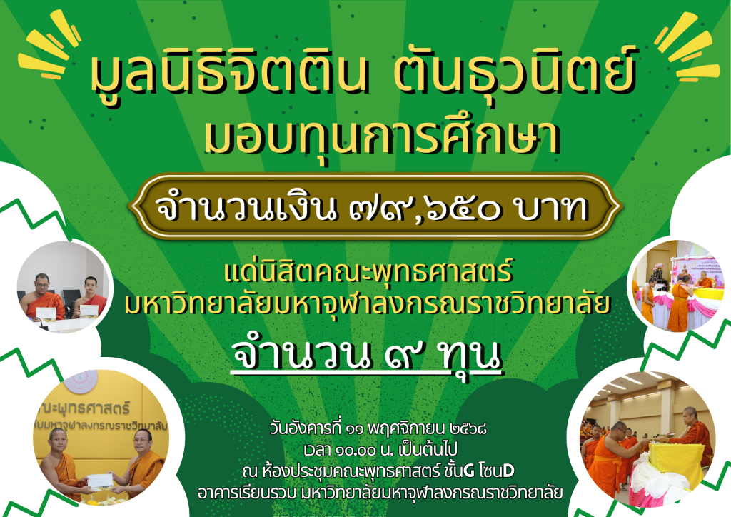ข่าวทุนการศึกษา! มูลนิธิจิตติน ตันธุวนิตย์ มอบทุนการศึกษา แด่นิสิตคณะพุทธศาสตร์ เดือน พฤศจิกายน 2568